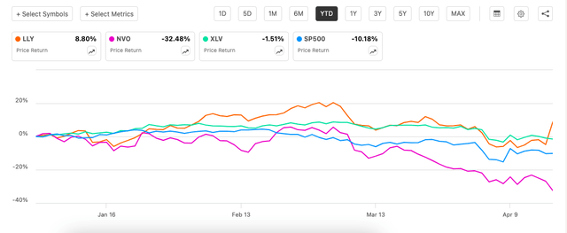 然而,并非所有医疗保健公司目前都处于优势地位。礼来公司的主要竞争对手诺和诺德公司就是一个很好的例子。如下图所示,诺和诺德年初至今 32% 的跌幅甚至远超标准普尔 500 指数,而礼来公司则上涨了约 9%。事实上,甚至可以说,诺和诺德目前的损失正是礼来的股价上涨。